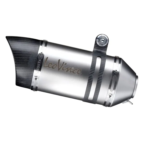 Ce silencieux utilise de l’acier inoxydable AISI 304, reconnu pour sa robustesse et sa résistance à la corrosion. L’embout en carbone, léger et thermorésistant, conserve son intégrité même à haute température (jusqu’à 900 °C). L’ensemble est maintenu par une sangle de fixation intégralement en fibre de carbone pour une solidité sans faille. Le logo LeoVince apposé au laser vient appuyer la finition soignée.